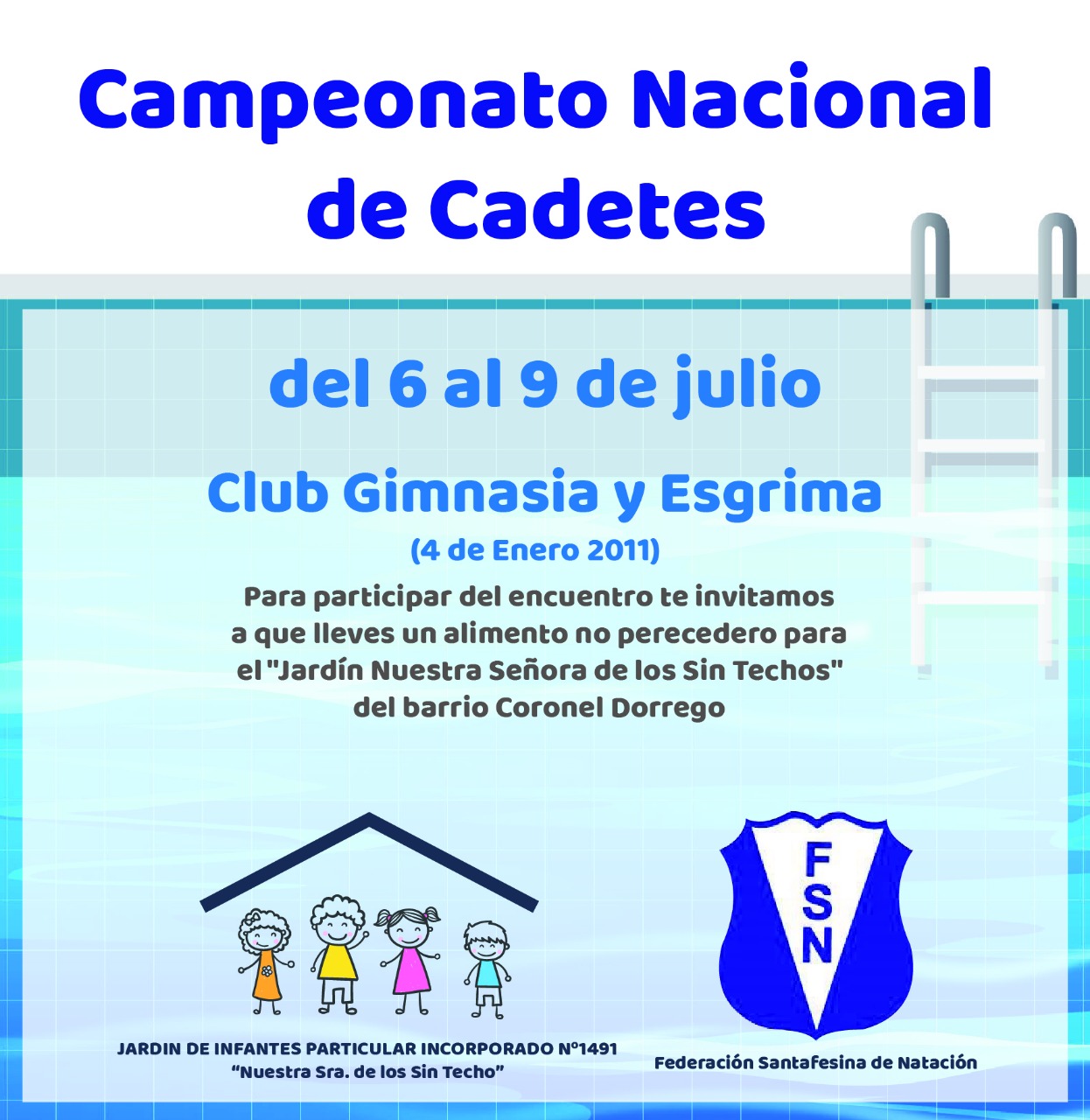 SOLIDARIDAD Durante el Campeonato Nacional de Cadetes del 6 al 9 de julio en las instalaciones del Club Gimnasia y Esgrima (4 de enero 2011), realizaremos una colecta solidaria para ayudar al jardín de infantes particular incorporado n° 1491 " Nuestra Señora de los Sin Techos" del barrio Coronel Dorrego. Si queres participar, sólo alcanzanos un alimento no perecedero durante el desarrollo del evento. SUMATE Desde ya muchas gracias.